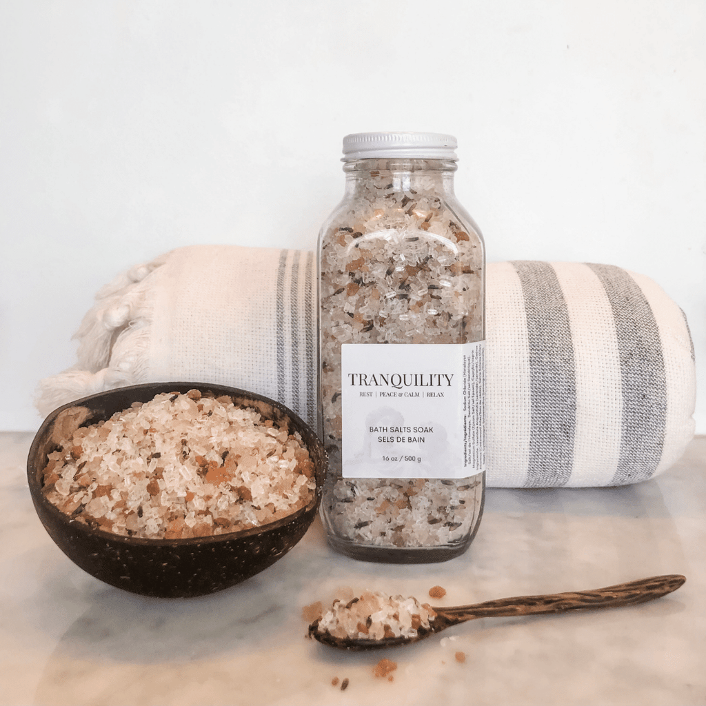 Melt away stress and immerse your senses in TRANQUILITY, a luxurious small-batch aromatherapy bath soak crafted with Pink Himalayan and Epsom salts, organic French lavender buds, and a therapeutic blend of pure essential oilslavender, clary sage, cedarwood, lemongrass, and grapefruit.