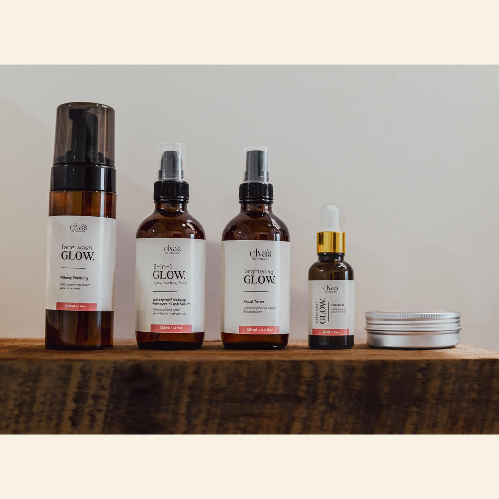 The GLOW Botanical Skincare System is an award-winning, 5-step collection of nutrient-dense, plant-based products designed to work synergistically — cleansing, rebalancing, hydrating, and rejuvenating your skin at every level.