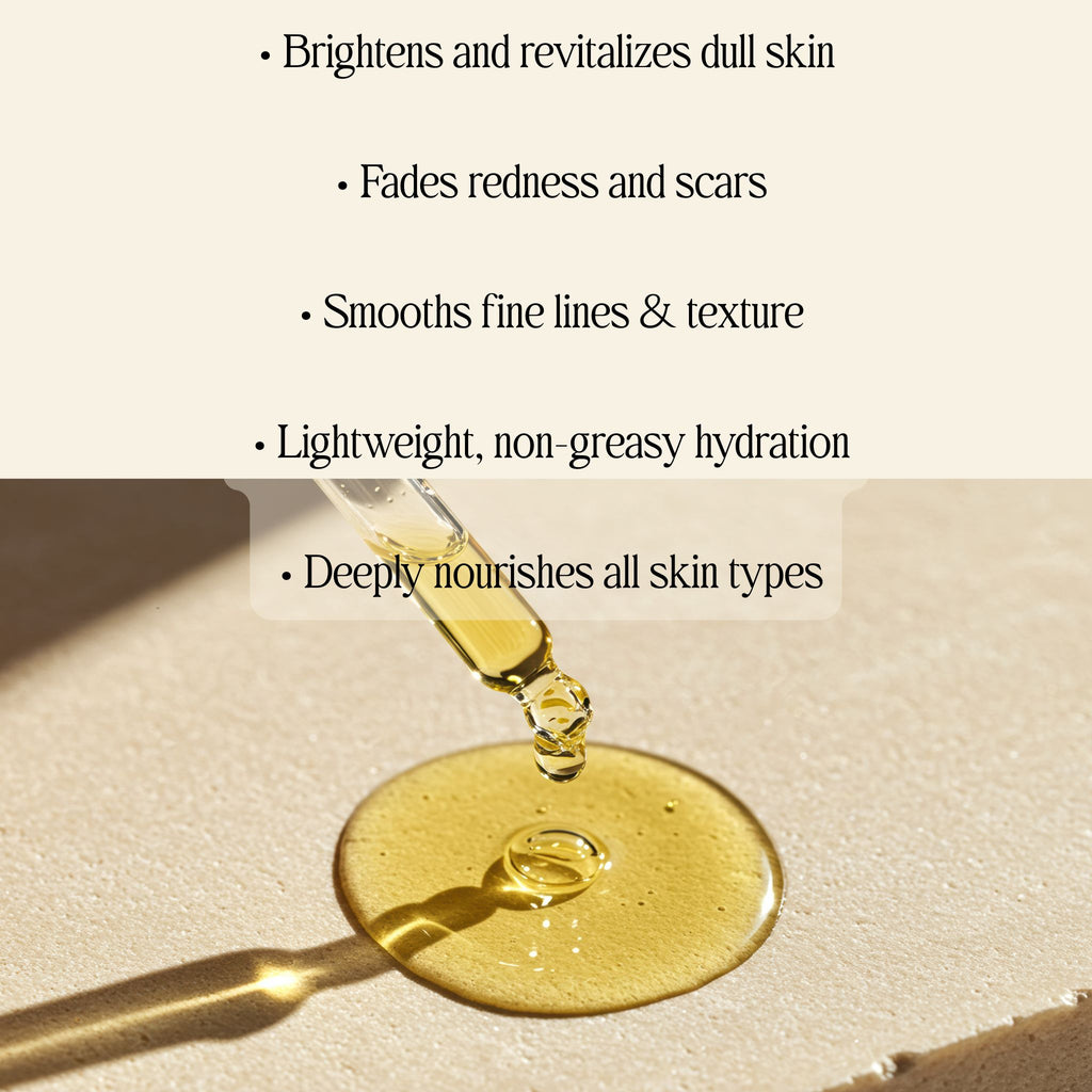 A lightweight, fast-absorbing elixir that smooths texture, fades redness and scars, and restores your skin’s natural luminosity — without feeling greasy or heavy.