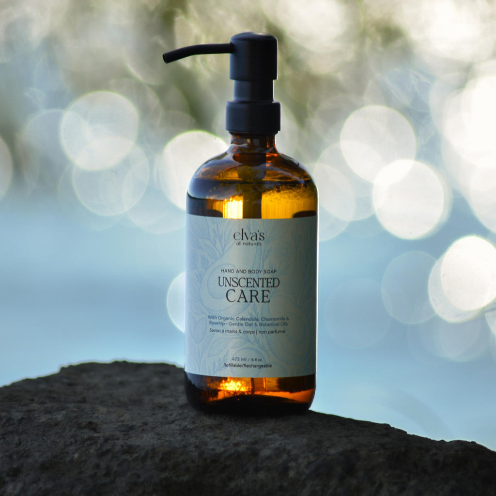 Discover Unscented Care — Elva’s most gentle hand soap and body wash, created for fragrance-free living and sensitive skin. This luxurious, pH-balanced formula is infused with organic calendula, chamomile, and rosehip to calm and restore, while soothing oatmeal and nourishing oils of sunflower, almond, avocado, hemp, and olive leave skin soft, hydrated, and comforted.