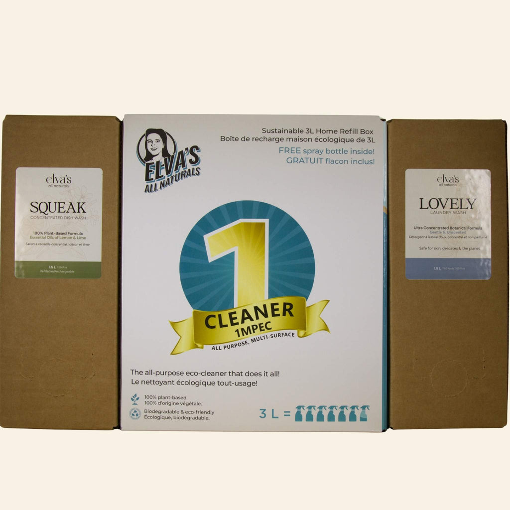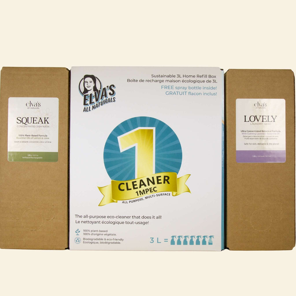 The Earth Bundle – Home Cleaning Trio makes sustainable cleaning simple. Featuring three refill boxes of your favourite Elva’s essentials, this pantry-sized set helps you eliminate plastic waste, reduce toxins, and save money — all while keeping your home naturally clean and safe.