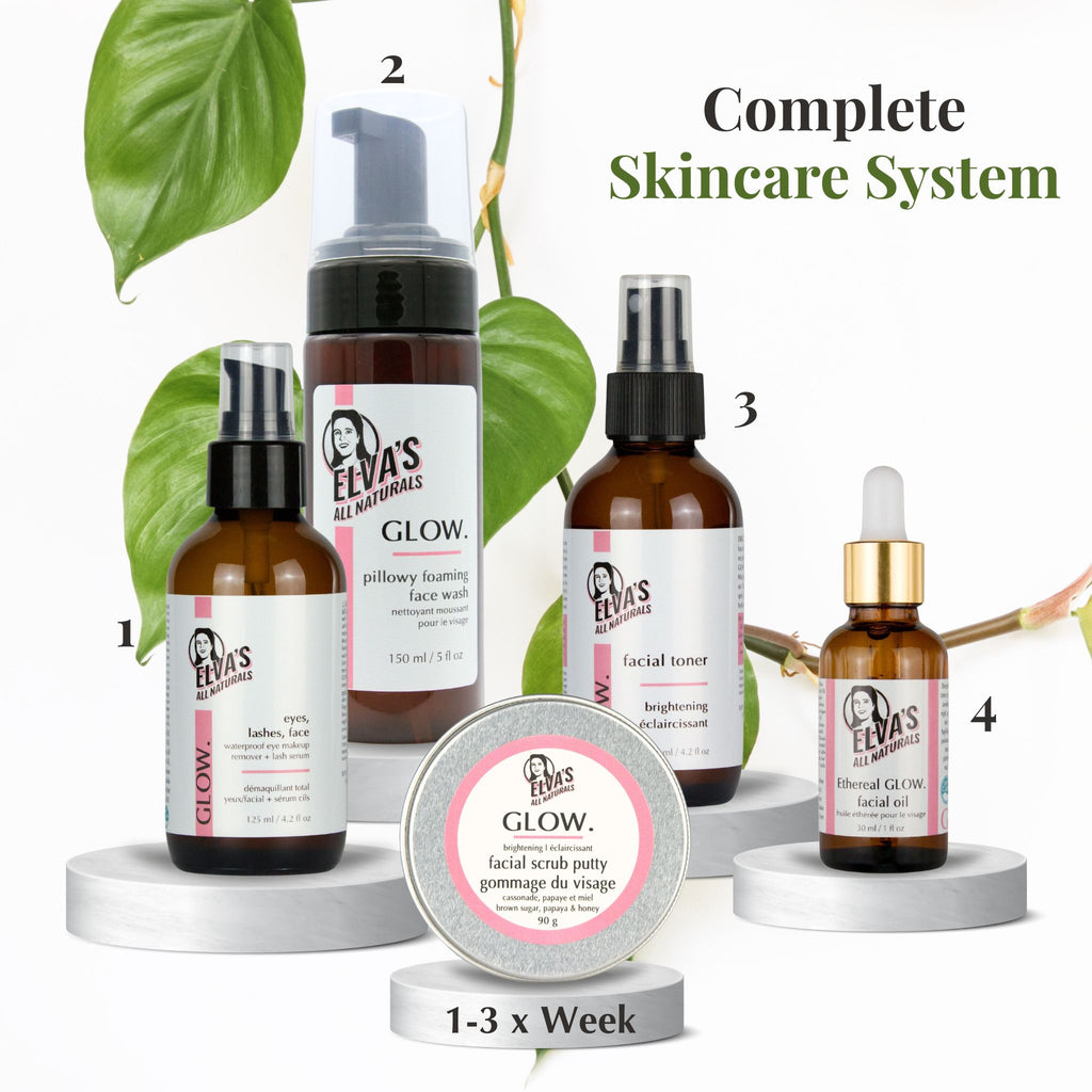 The GLOW Botanical Skincare System is an award-winning, 5-step collection of nutrient-dense, plant-based products designed to work synergistically — cleansing, rebalancing, hydrating, and rejuvenating your skin at every level.